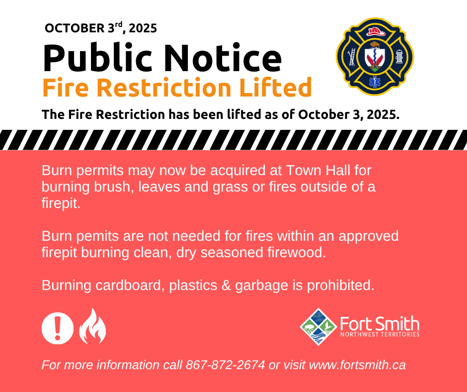 As of today, October 3rd, 2025 the Fort Smith Protective Services has lifted the Town wide Fire Restriction in place since June 30th.