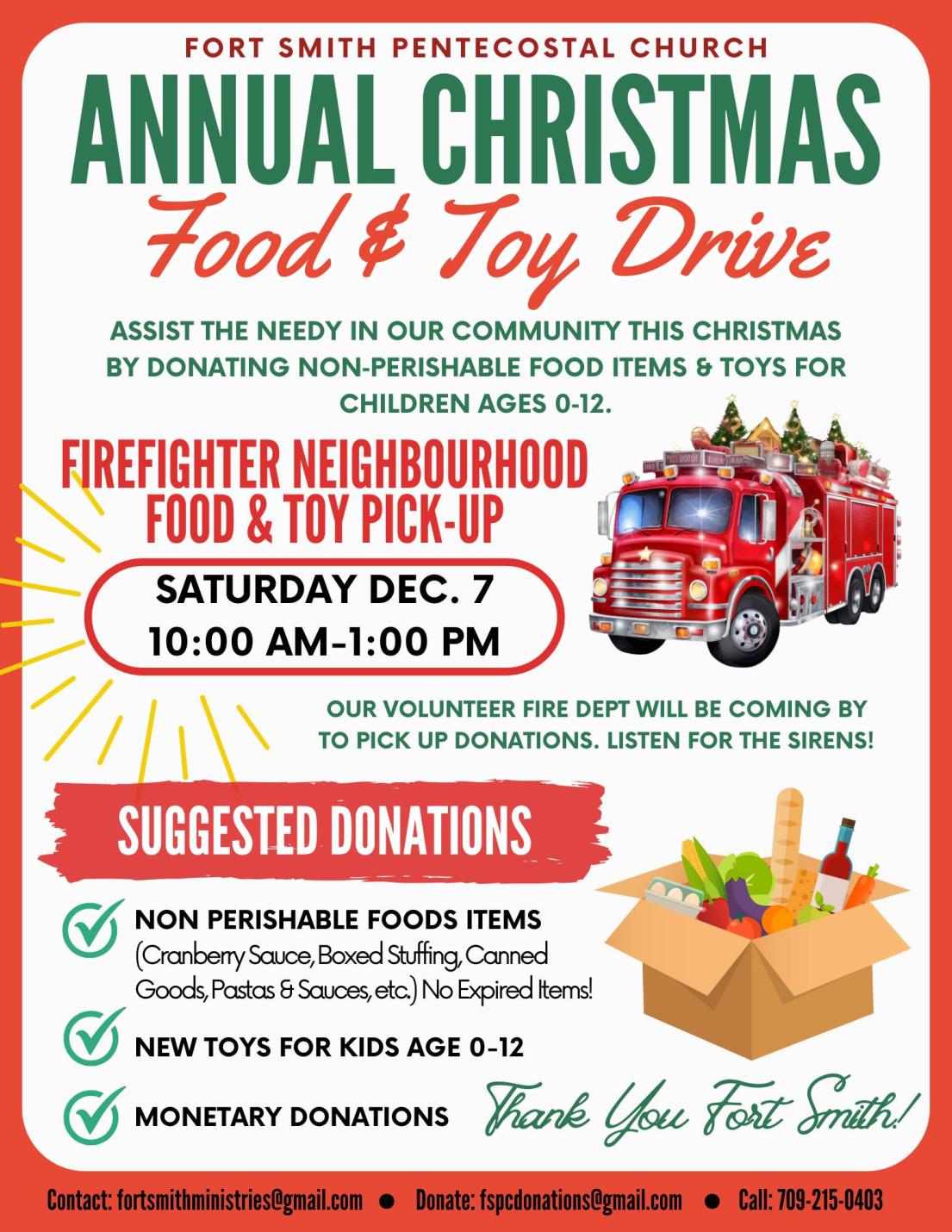 Fort Smith Pentecostal Church, in collaboration with the Fort Smith Protective Services, is collecting non-perishable food items and toys for children aged 0-12—and we need your help!