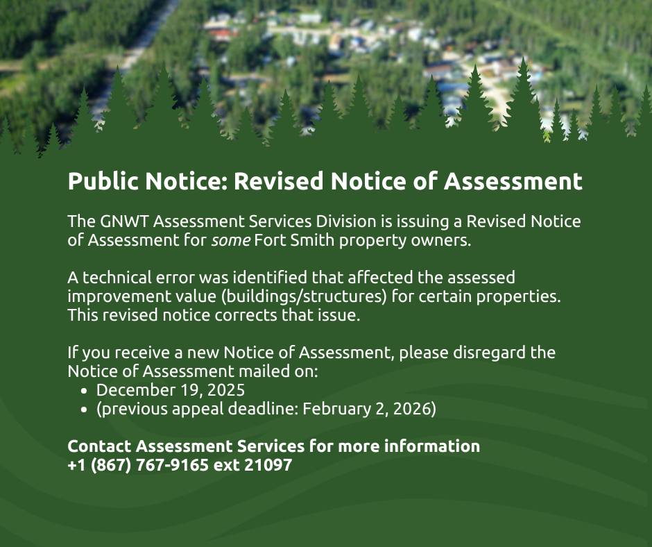The GNWT Assessment Services Division is issuing a Revised Notice of Assessment for some Fort Smith property owners.