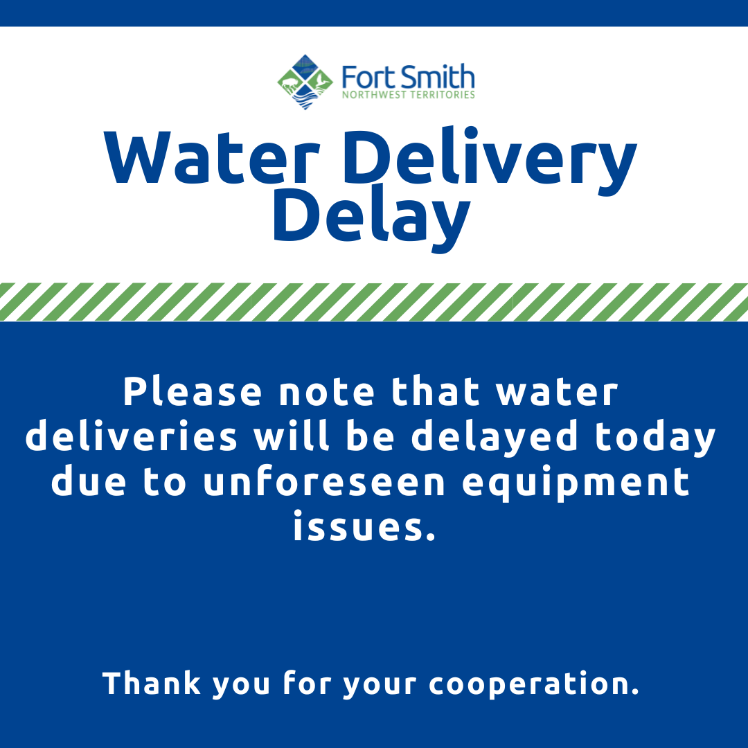 Jun 3 2025 Type(s) Public Notice Please note that water deliveries will be delayed today due to unforeseen equipment issues.